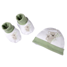Βρεφικό σετ για νεογέννητο σε λευκό χρώμα με πράσινες λεπτομέρειες και σχέδιο κοάλα. Το σετ αποτελείται από βρεφικά καλτσάκια και σκουφάκι κατάλληλα για βρέφη από 0 έως 1 μηνών. Κατασκευασμένα από 100% οικολογικό βαμβάκι που τα καθιστά εξαιρετικά απαλά και ανθεκτικά.