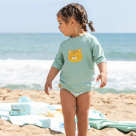 Παιδική μπλούζα με αντηλιακή προστασία από την εταιρεία Saro σε πράσινο χρώμα με ζωάκι στο σχέδιο. Είναι κατασκευασμένο από 85% πολυεστέρα και 15% ελαστάνη που το καθιστά ελαφρύ και αναπνεύσιμο. Έχει προστασία UV UPF 50+. Ιδανικό για την παραλία και την πισίνα. Το ύφασμά του είναι πολύ απαλό και εύκαμπτο. Έχει επίσης υψηλό επίπεδο αντοχής στο χλώριο, ιδανικό για χρήση στην πισίνα. Κατασκευασμένο από υλικό που στεγνώνει πιο γρήγορα από τα κοινά μαγιό. Σύμφωνα με το Ευρωπαϊκό πρότυπο EN 13758-1:2001+A1:2006 και το EN 13758-2:2003+A1:2006.