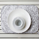 Σουπλά φαγητού σε γκρι απόχρωση και εκρού λεπτομέρειες από την εταιρία Melinen. Το ύφασμα είναι από 100% microfiber. Χρησιμοποιείται για το φαγητό και για να προστατεύσει επιφάνειες, όπως το τραπέζι, το πάσο, κλπ.
