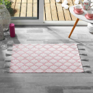 Πατάκι με μοντέρνο σχέδιο σε ροζ χρώμα και λευκές-ασημί λεπτομέρειες. Είναι κατασκευασμένο από 100% βαμβάκι και διαθέτει γκρι διακοσμητικά φουντάκια στις 2 πλευρές.