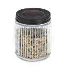 Βάζο για την κουζίνα κατασκευασμένο από διάφανο ανάγλυφο γυαλί με βιδωτό μεταλλικό καπάκι σε μαύρο χρώμα. Ιδανικό για να τοποθετήσετε μέσα μπαχαρικά, όσπρια ή ότι άλλο θέλετε. Χωρητικότητα: 520ml. Συνδυάστε το με τα υπόλοιπα είδη της ίδιας συλλογής για ένα ολοκληρωμένο αποτέλεσμα στη κουζίνα σας.
