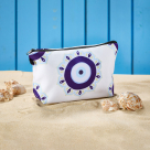 Τσαντάκι θαλάσσης από την εταιρεία Whitegg, σε λευκό χρώμα με μπλε μοντέρνο σχέδιο μάτι. Είναι κατασκευασμένο από 100% πολυεστέρα. Κλείνει με φερμουάρ και διαθέτει λουράκι για να το έχετε μαζί σας παντού. Ιδανικό νεσεσέρ για να μεταφέρετε μικροαντικείμενα εύκολα όπου εσείς επιθυμείτε.