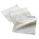 Πετσέτες φαγητού σε λευκό χρώμα με γκρι -μπεζ λεπτομέρειες και ριγέ σχέδιο. Το ύφασμα είναι από 66% βαμβάκι και 34% polyester. Συνδυάστε τες με τα υπόλοιπα είδη της ίδιας συλλογής για να ένα εντυπωσιακό αποτέλεσμα.