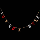 Διακοσμητική γιρλάντα με φωτάκια Led και πολύχρωμα γράμματα που σχηματίζουν JOYEUX NOEL. Είναι κατασκευασμένη από τσόχα σε μπεζ, λευκό και μπορντώ χρώμα. Το συνολικό μήκους του καλωδίου είναι 160εκ. και διαθέτει στο τέλος του διακόπτη ON/OFF. Λειτουργεί με 2 μπαταρίες ΑΑ οι οποίες δεν περιλαμβάνονται. Τα Led παράγουν θερμό λευκό φως και λειτουργούν με μπαταρίες.
