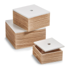 Κουτιά αποθήκευσης σε σετ 3 τεμαχίων. Είναι κατασκευασμένα από ξύλο paulownia σε μπεζ χρώμα με λευκό καπάκι που διαθέτει οπή, για να μπορείτε να τα ανοίγετε. Μπορείτε να τα χρησιμοποιήσετε σαν αποθηκευτικό χώρο σε ένα ράφι, ντουλάπι , στο μπάνιο, στην κρεβατοκάμαρα ή όπου αλλού θελήσετε.