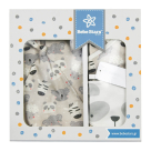 Βρεφικό σετ δώρου με εκρού φόντο και σχέδιο ζωάκια με γκρι λεπτομέρειες από την εταιρεία Bebe Stars. Τα υφάσματα είναι από 100% βαμβάκι που προσφέρει ανθεκτικότητα και απαλότητα. Το σετ περιλαμβάνει 1 παντελονάκι με κλειστά ποδαράκια, 2 φορμάκια με θήκες στα μανίκια που αποτρέπουν τυχόν γρατζουνιές (το 1 φορμάκι έχει ποδαράκια), 1 σαλιάρα διπλής όψης και 1 σκουφάκι. Κατάλληλο για μωρά 6-9 μηνών. Ιδανικό σετ για δώρο καθώς έρχεται σε συσκευασία κουτί.