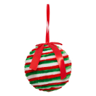 Χριστουγεννιάτικη μπάλα με ρίγες σε πράσινο-κόκκινο-λευκό χρώμα. Είναι κατασκευασμένη από πλαστικό με επένδυση από λούτρινο ύφασμα και έχει κορδελάκι για να την κρεμάτε. Συνδυάστε την με τα υπόλοιπα στολίδια για ένα εντυπωσιακό αποτέλεσμα στο δέντρο σας.