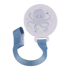 Κλιπ πιπίλας σε λευκό-γαλάζιο χρώμα και σχέδιο χταπόδι. Πιάνεται στο ρουχαλάκι του μωρού για να μην πέφτει η πιπίλα στο πάτωμα και να παραμένει καθαρή.
