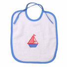 Σαλιάρα για να προστατέψετε τα ρουχαλάκια του μωρού σας σε λευκό χρώμα με απλικέ σχέδιο καράβι και γαλάζιο περιμετρικό ρέλι. Πετσετέ ύφασμα από 100% βαμβάκι χωρίς αδιάβροχη επιστρώση στην πίσω μεριά.
