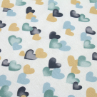 Πάνα χασέ της εταιρείας Dimcol σε εκρού χρώμα με σχέδιο καρδιές σε γαλάζιο-βεραμάν-ώχρα-γκρι χρώμα. Το ύφασμα είναι από 100% βαμβάκι 144 κλωστών που προσφέρει απαλότητα για να τυλίξετε το μωρό σας. Συσκευασία Polybag. Ελληνικής κατασκευής.