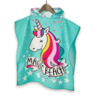 Παιδικό πόντσο σε τυρκουάζ χρώμα, με πολύχρωμες λεπτομέρειες και σχέδιο μονόκερος από την εταιρεία Whitegg. Έχει πετσετέ υφή και είναι κατασκευασμένο από 100% microfiber με απορροφητικά νήματα, που το καθιστούν απαλό στην αφή και ανθεκτικό στη χρήση.
