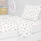 Παιδικό σεντόνι και μαξιλαροθήκη από την DimCol σε λευκό χρώμα και σχέδιο αστέρια με ροζ - γκρι λεπτομέρειες. Το ύφασμα είναι από 100% βαμβάκι 144 κλωστών. Είναι απαλά στην αφή και ανθεκτικά στη χρήση. Συσκευασία κουτί.
