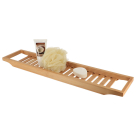 Ράφι μπανιέρας σε μπεζ χρώμα, κατασκευασμένο από ξύλο bamboo. 'Έχει τρύπες για να αποφεύγεται η συσσώρευση υγρασίας. Ιδανικό για να οργανώσετε τα μπουκάλια των σαμπουάν και των αφρόλουτρών σας.