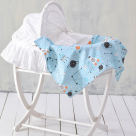 Σεντόνια το λίκνο ή την καλαθούνα του μωρού με σχέδιο διάστημα σε γαλάζιο χρώμα και μπλε-κίτρινες λεπτομέρειες. Η σύνθεσή του από 100% βαμβάκι 144 κλωστών, το καθιστά απαλό και ανθεκτικό. Ιδανικό για αγοράκια.