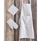 Σετ κουζίνας σε γκρι ανοιχτό χρώμα και ανάγλυφη πλέξη σε καρό σχέδιο από την εταιρεία Rythmos. Η σύνθεση τους αποτελείται από 100% βαμβάκι με ζακάρ νηματοβαφή που τα καθιστά ανθεκτικά και ιδανικά για καθημερινή χρήση. Το σετ περιλαμβάνει μία ποδιά με τσέπη, ένα γάντι και μία πιάστρα.