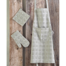 Σετ κουζίνας σε χακί χρώμα και ανάγλυφη πλέξη σε καρό σχέδιο από την εταιρεία Rythmos. Η σύνθεση τους αποτελείται από 100% βαμβάκι με ζακάρ νηματοβαφή που τα καθιστά ανθεκτικά και ιδανικά για καθημερινή χρήση. Το σετ περιλαμβάνει μία ποδιά με τσέπη, ένα γάντι και μία πιάστρα.