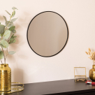 Επιτοίχιος στρογγυλός καθρέφτης με μίνιμαλ σχεδιασμό, ιδανικός για να διακοσμήσει το υπνοδωμάτιο, το χωλ ή σε όποιο άλλο χώρο ταιριάζει. Το πλαίσιο είναι κατασκευασμένο από μεταλλικό υλικό σε μαύρο χρώμα, ενώ η πλάτη από ξύλο MDF. Διαθέτει υποδοχή για κρέμασμα στο πίσω μέρος. Μπορεί να λειτουργήσει ως χρηστικό και ως διακοσμητικό στοιχείο στο χώρο σας.