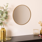 Επιτοίχιος στρογγυλός καθρέφτης με μίνιμαλ σχεδιασμό, ιδανικός για να διακοσμήσει το υπνοδωμάτιο, το χωλ ή σε όποιο άλλο χώρο ταιριάζει. Το πλαίσιο είναι κατασκευασμένο από μεταλλικό υλικό σε χρυσό χρώμα, ενώ η πλάτη από ξύλο MDF. Διαθέτει υποδοχή για κρέμασμα στο πίσω μέρος. Μπορεί να λειτουργήσει ως χρηστικό και ως διακοσμητικό στοιχείο στο χώρο σας.