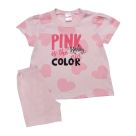 Παιδικές πιτζάμες από τη συλλογή Minervakia της εταιρείας Minerva. Πρόκειται για σετ από κοντομάνικη μπλούζα με σορτσάκι. Έχουν ροζ χρώμα, μοτίβο με καρδούλες και τύπωμα στο κέντρο. Είναι κατασκευασμένες από 100% βαμβακερό ύφασμα, που προσδίδει ιδιαίτερη απαλότητα, αντοχή και σωστή εφαρμογή. Είναι ιδιαίτερα ανθεκτικές και διατηρούν τη φόρμα τους. Τα χρώματα έχουν δημιουργηθεί με την μέθοδο της νηματοβαφής (μέσα στην ύφανση), με αποτέλεσμα να παραμένουν αναλλοίωτα στην χρήση και τις πλύσεις. Σε όλα τα στάδια παραγωγής έχουν χρησιμοποιηθεί υποαλλεργικά υλικά χωρίς επιβλαβείς ουσίες προς την υγεία. Διαθέτουν τα διεθνή πιστοποιητικά ποιότητας και ασφάλειας ISO 9001:2000 , ISO 9002, Oeko-Tex Standard 100, Eco Textile Label. Αποτελούν προϊόντα ελληνικής ραφής με την εγγύηση ποιότητας και αξιοπιστίας της εταιρείας Minerva. Μεγεθολόγιο ανάλογα με ηλικία και ύψος παιδιού: Νο1 (1-2 ετών, 78-90cm), Νο2 (2-3 ετών, 90-98cm), No3 (3-4 ετών, 98-104cm), No4 (4-6 ετών, 104-116cm), No6 (6-8 ετών, 116-128cm), No8 (8-10 ετών, 128-140cm), No10 (10-12 ετών, 140-152cm), No12 (12-14 ετών, 152-164cm για αγόρι, 152-158cm για κορίτσι), No14 (14-16 ετών, 164-172cm για αγόρι, 158-164cm για κορίτσι), No16 (16-18 ετών, 172-180cm για αγόρι, 164-170cm για κορίτσι)