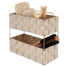 Ραφιέρα για την οργάνωση του μπάνιου σας με μοντέρνο σχεδιασμό. Είναι κατασκευασμένη από πολυεστερικό ύφασμα σε μπεζ χρώμα με μεταλλικό σκελετό για να στέκεται. Έχει δύο ράφια για να τακτοποιήσετε όλα τα απαραίτητα αντικείμενα του μπάνιου σας. Μπορεί να κρεμαστεί όπου θέλετε από το πάνω μέρος. Συνδυάστε τη με τα υπόλοιπα είδη της ίδιας σειράς για ένα ολοκληρωμένο αποτέλεσμα.