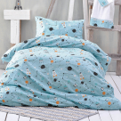 Μονό κουβερλί με σχέδιο διάστημα σε γαλάζιο χρώμα και μπλε-κίτρινες λεπτομέρειες. Η σύνθεσή του εξωτερικού υφάσματος είναι από 100% βαμβάκι 144 κλωστών που το καθιστά απαλό και ανθεκτικό. Η γέμιση είναι από πολυεστερική βάτα. Ιδανικό ανοιξιάτικο-καλοκαιρινό σκέπασμα για αγοράκια.