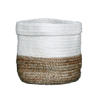 Καλάθι αποθήκευσης σε μπεζ-λευκό χρώμα από την εταιρεία Viopros. Το υλικό είναι jute με μέρη από βαμβάκι. Ιδανικό για το καθιστικό, το μπάνιο, το παιδικό δωμάτιο ή οποιοδήποτε άλλο χώρο του σπιτιού έχει μικροπράγματα για τακτοποίηση.